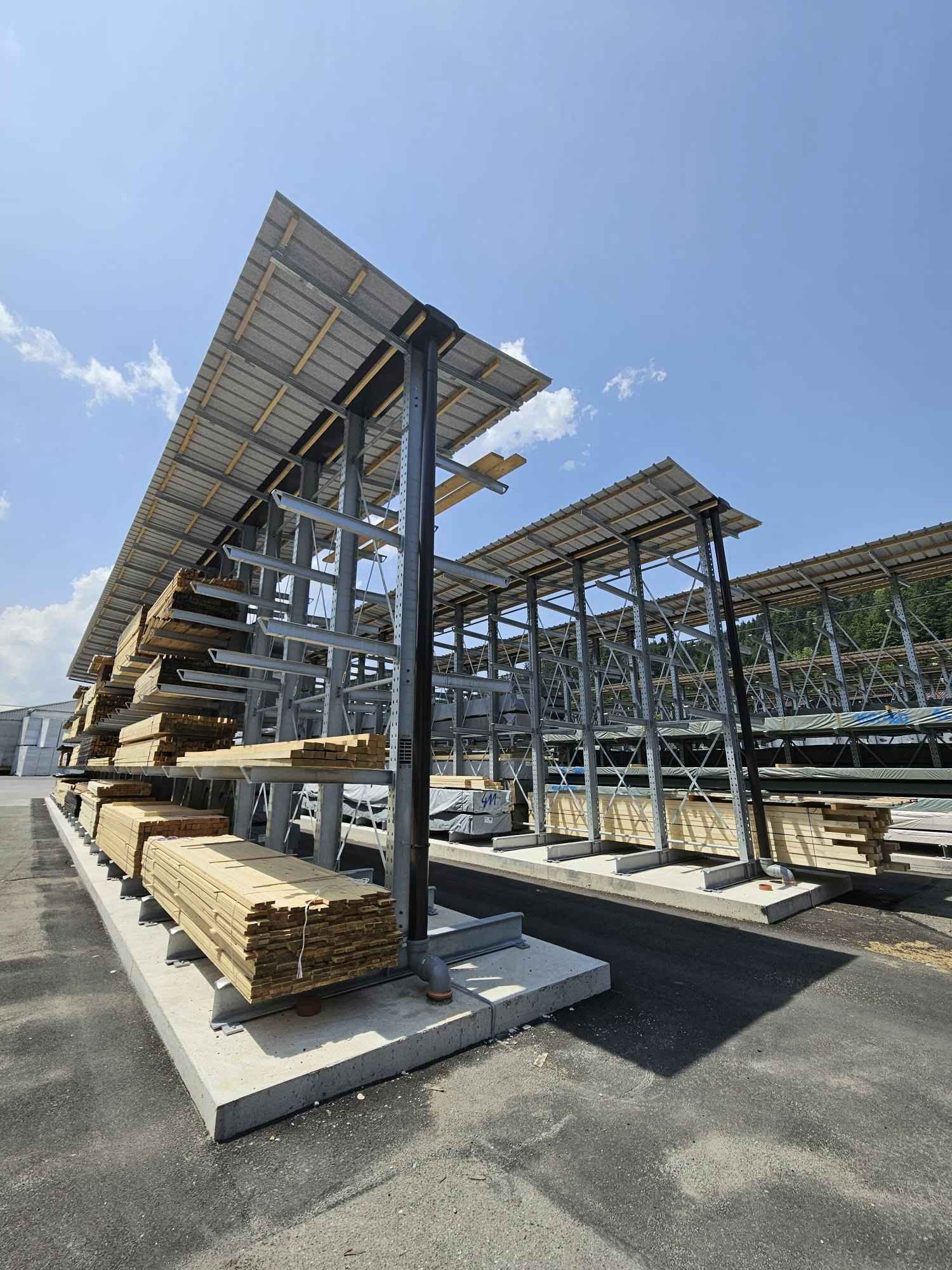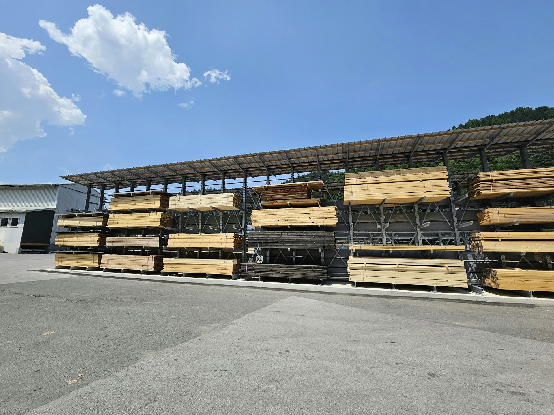Marles therefore decided to replace the existing warehouse with ten rows of cantilever racking from OHRA. The racks with a stand height of 6,080 millimetres allow the timber packages to be stored on four levels and therefore offer significantly more storage capacity in the same space. Direct access to each article is also possible. An integrated, 1.5 metre deep roof protects the stored wood from the weather, while the racks themselves are hot-dip galvanised.
