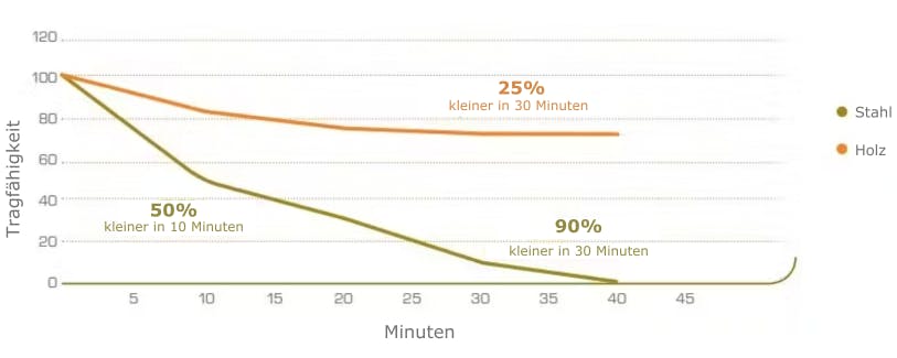 Die Grafik rechts zeigt einen Vergleich des Festigkeitsverlustes einer Stahlkonstruktion im Vergleich zu einer Holzkonstruktion: