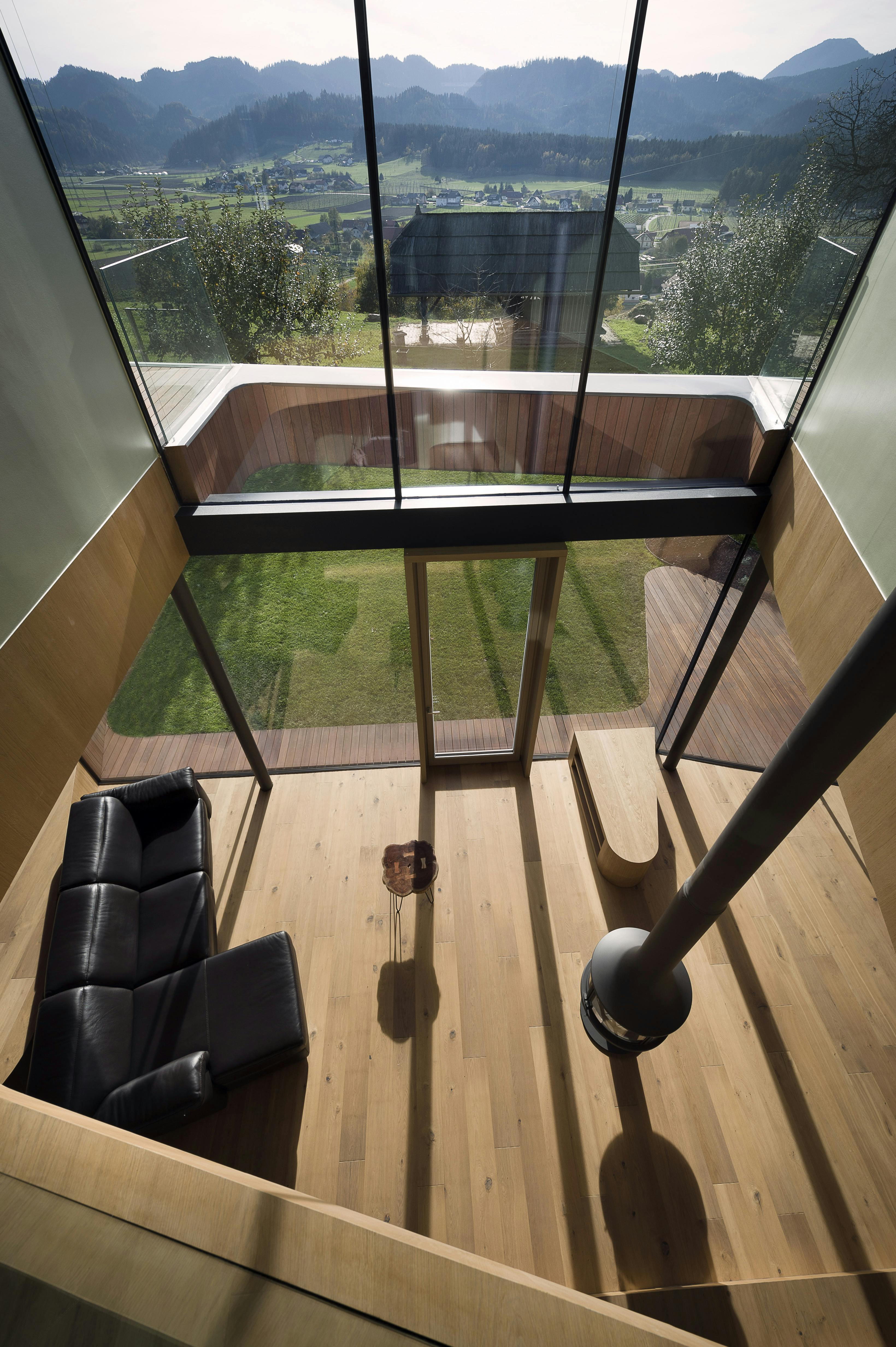 „Damit wird ein räumliches Ambiente geschaffen, das je nach Jahreszeit und Tagesabschnitt unterschiedliche Interaktionsebenen und Nutzungsmöglichkeiten des Hauses ermöglichen. Die optimale Ausrichtung des Hauses ermöglicht einen passiven Standard des Energieverbrauchs, der aus dem Einsatz einer Wärmepumpe, Wärmerückgewinnung und intensive Dachbegrünung hervorgeht. Das Haus basiert auf unnachgiebiger Disziplin fürs Detail und hochwertiger Ausführung. Es ist nicht nur rational, sondern auch poetisch, verspielt und geistreich.“