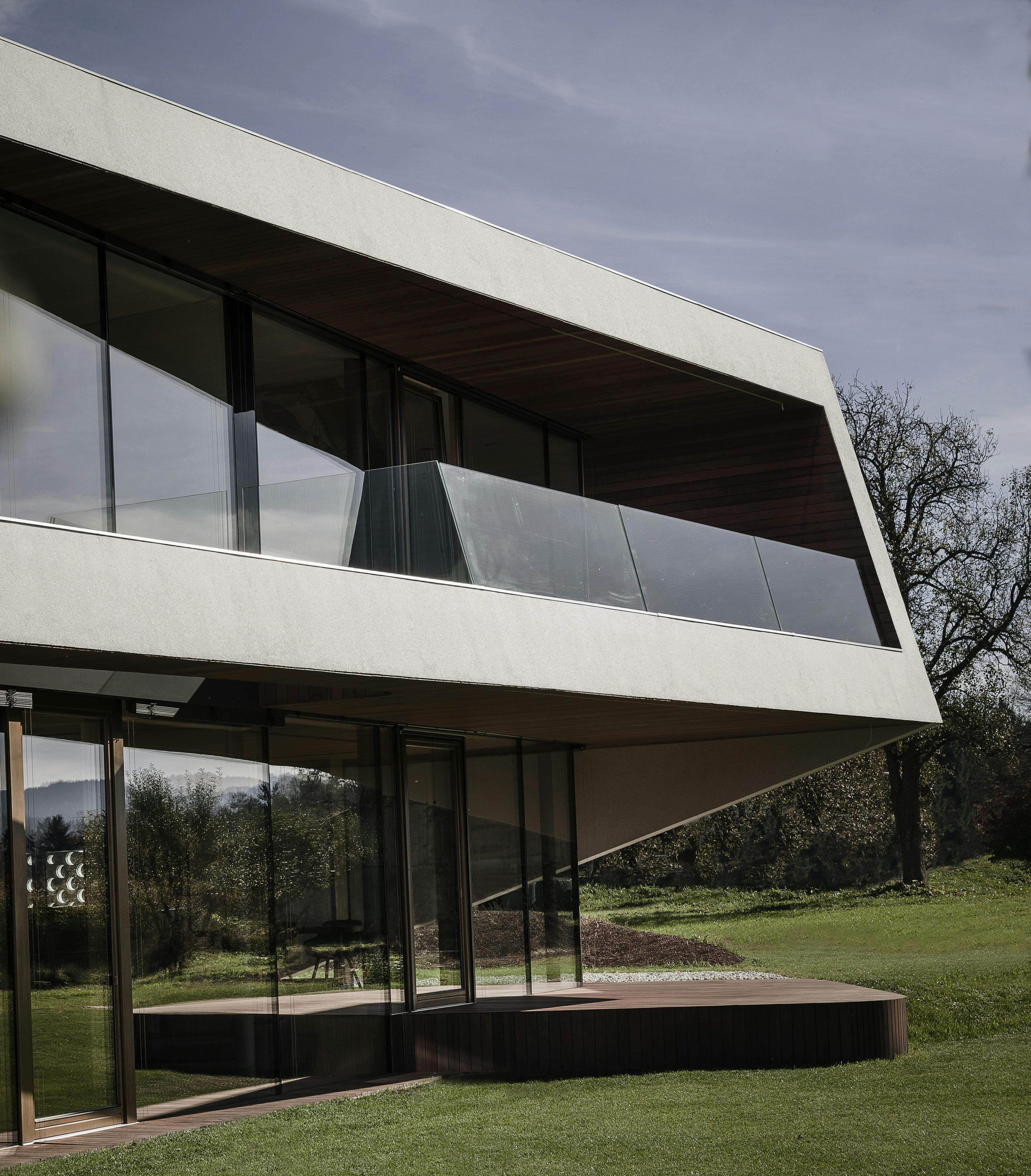 Wenn die Dunkelheit über das Podgorje-Tal bei Slovenj Gradec hereinbricht, schalten sich im NB-Haus die Lichter ein. Im Untergeschoss merkt man sofort, dass die beiden Bewohner Naturliebhaber sind. Der Blick aus dem Wohnzimmer Richtung Südwesten offenbart die ganze Schönheit der hiesigen Landschaft. Gebaut nach allen modernen Parametern eines energieeffizienten Gebäudes, liebäugelt es mit dem Konzept der synchronen Verbindung des Innenraums mit dem Außenbereich.