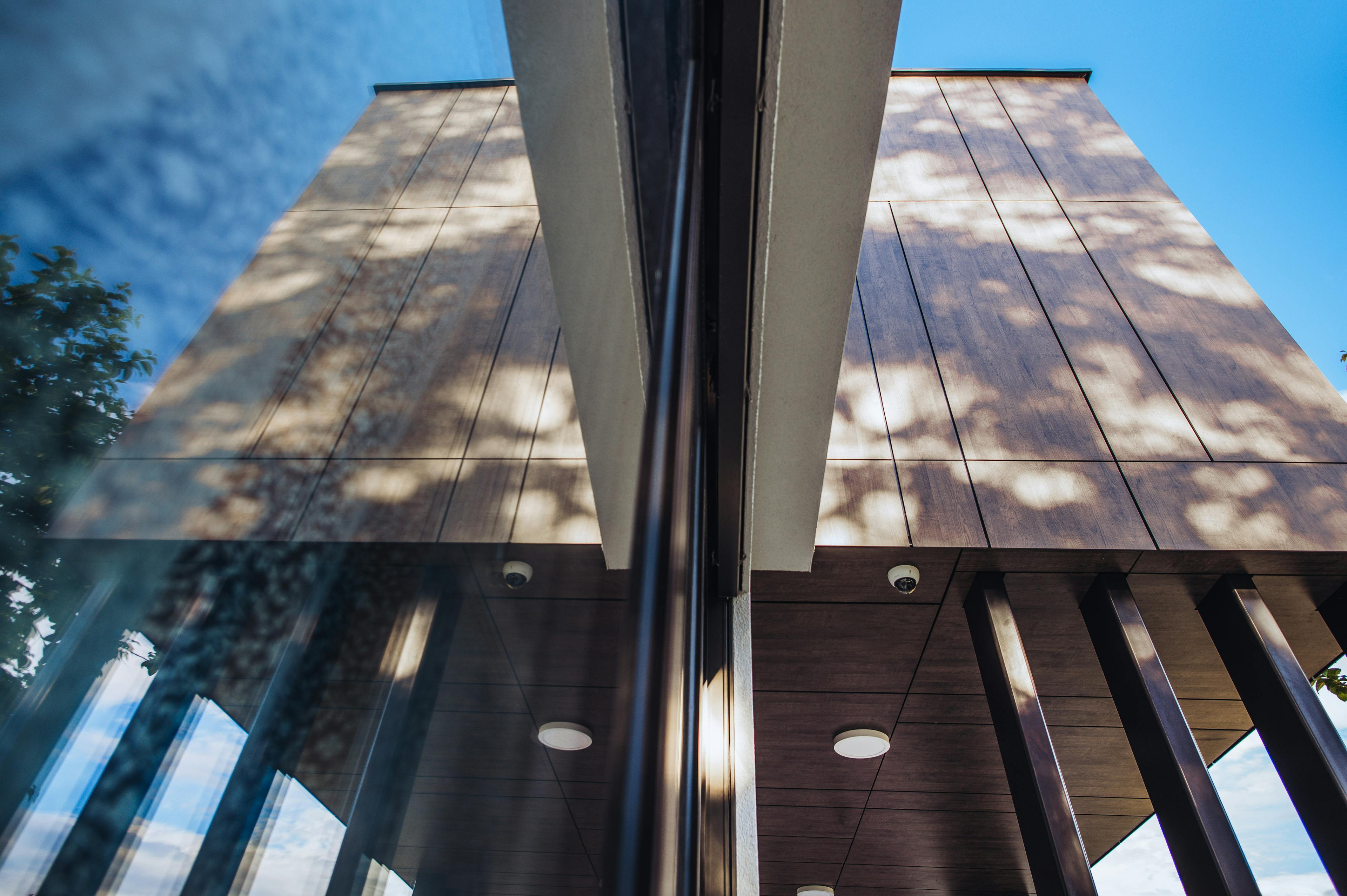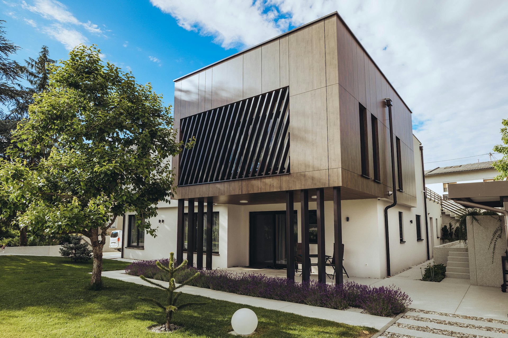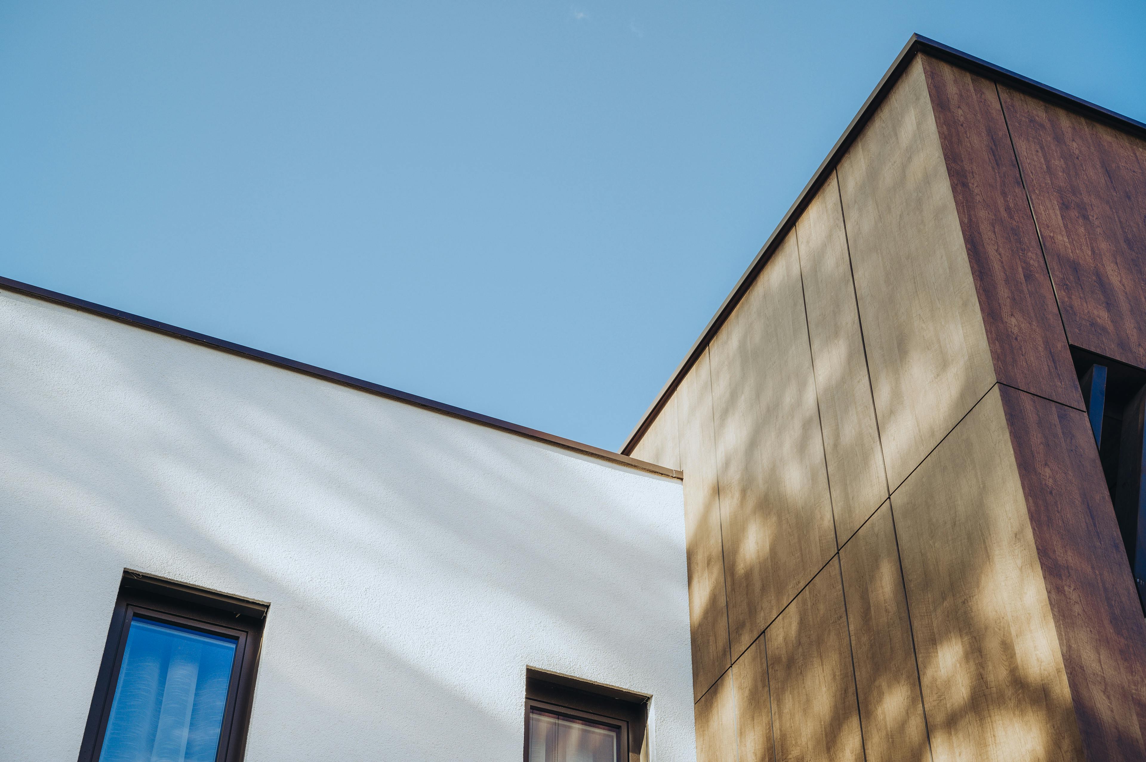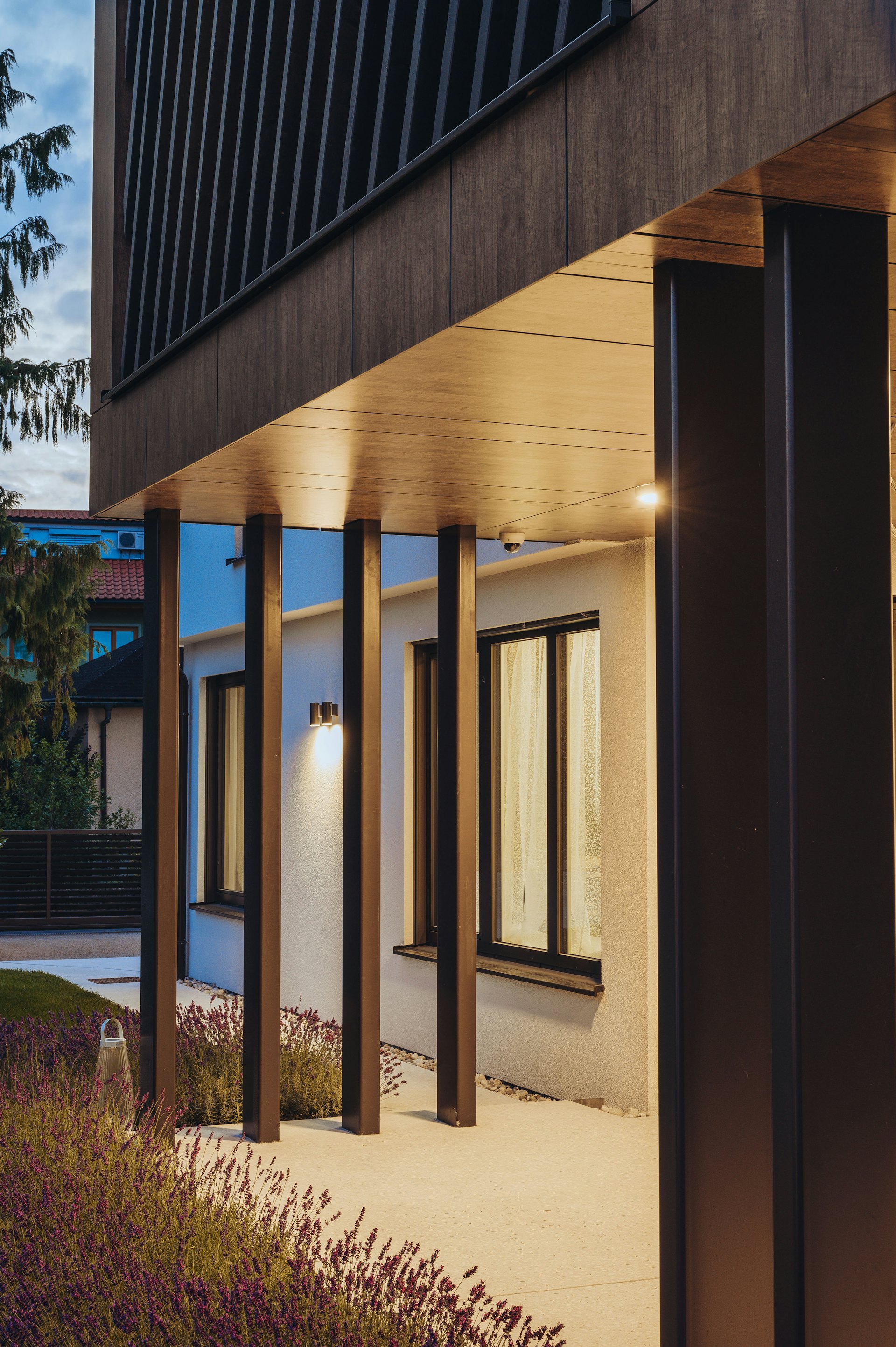 Das Obergeschoss ist vor allem für die Eigentümer gedacht. Es verfügt über ein geräumiges Schlafzimmer, Ankleidezimmer, zwei Badezimmer und eine Galerie, ein Fitnessraum und ein Nähzimmer mit Balkon. Die Schlafzimmer im Obergeschoss haben die Form eines Kubus und sind mit Trespa-Fassadenplatten verkleidet, während der Rest des Hauses mit einer Kontaktfassade umgeben ist.