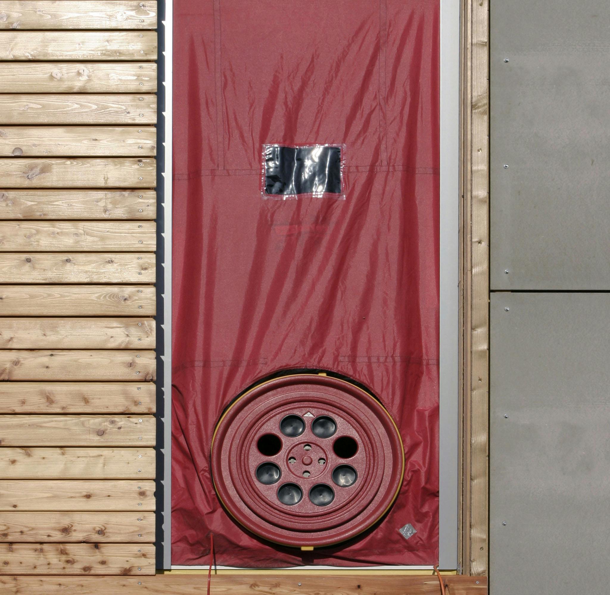 Um die Luftdichtheit des Gebäudes sicherzustellen, führen wir einen Blower-Door-Test durch, bei dem die Menge des unkontrollierten Luftdurchgangs aus dem Gebäude gemessen wird. Luftdichtheit verhindert den unkontrollierten Durchtritt von Außenluft, was für eine gute thermische Hülle von entscheidender Bedeutung ist.
