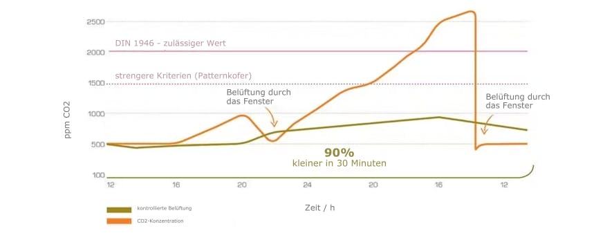 Die Grafik zeigt den CO2-Gehalt im Schlafzimmer über einen Zeitraum von 24 Stunden. Das Marles-Komfortlüftungssystem sorgt stets für einen optimalen CO2-Gehalt, der für ein gesundes Wohnen unerlässlich ist. Ein Vergleich mit einer herkömmlichen, die einen Anstieg der CO2-Konzentration verursacht, zeigt, die energetisch und gesundheitlich suboptimale Praxis des Fensteröffnens.