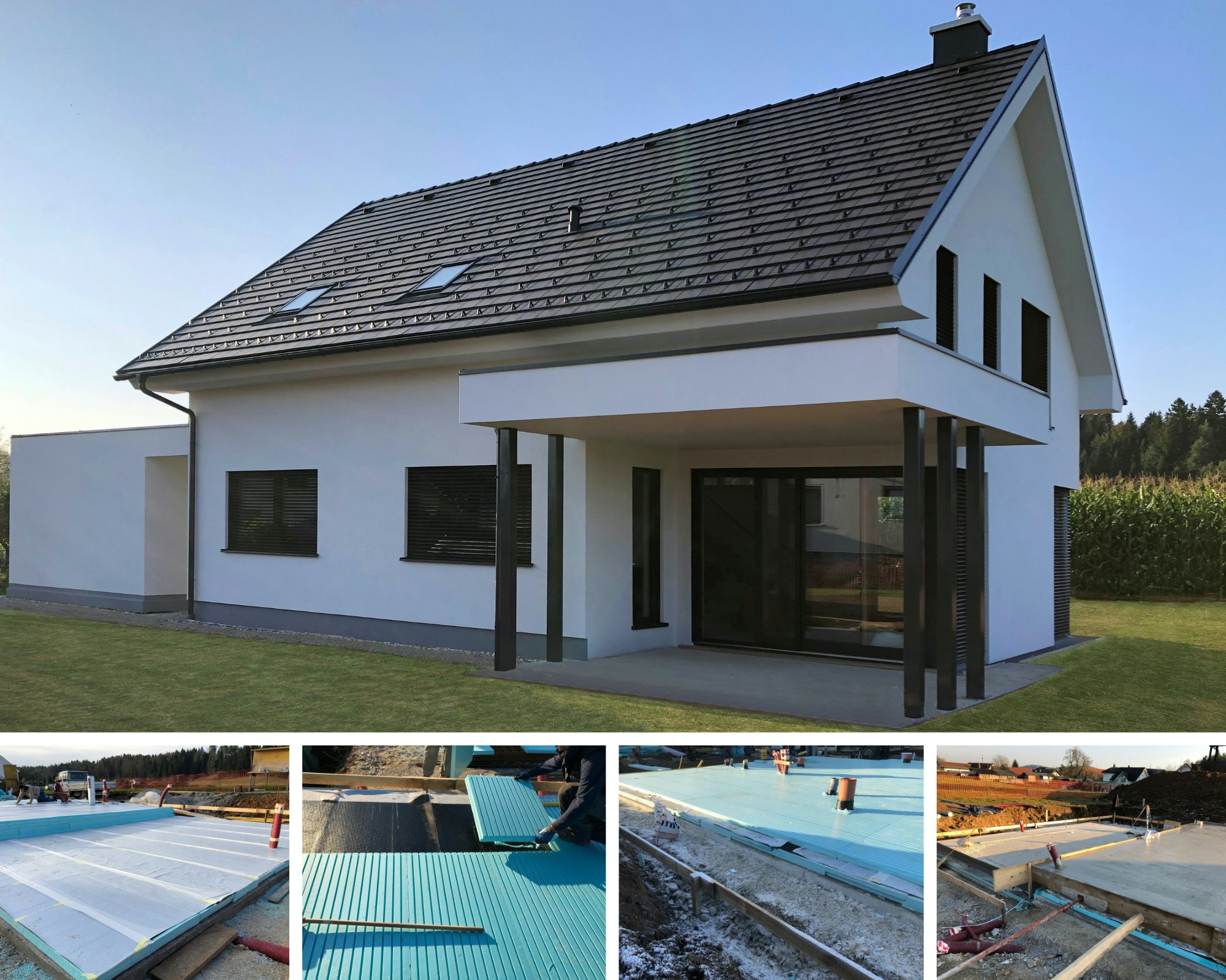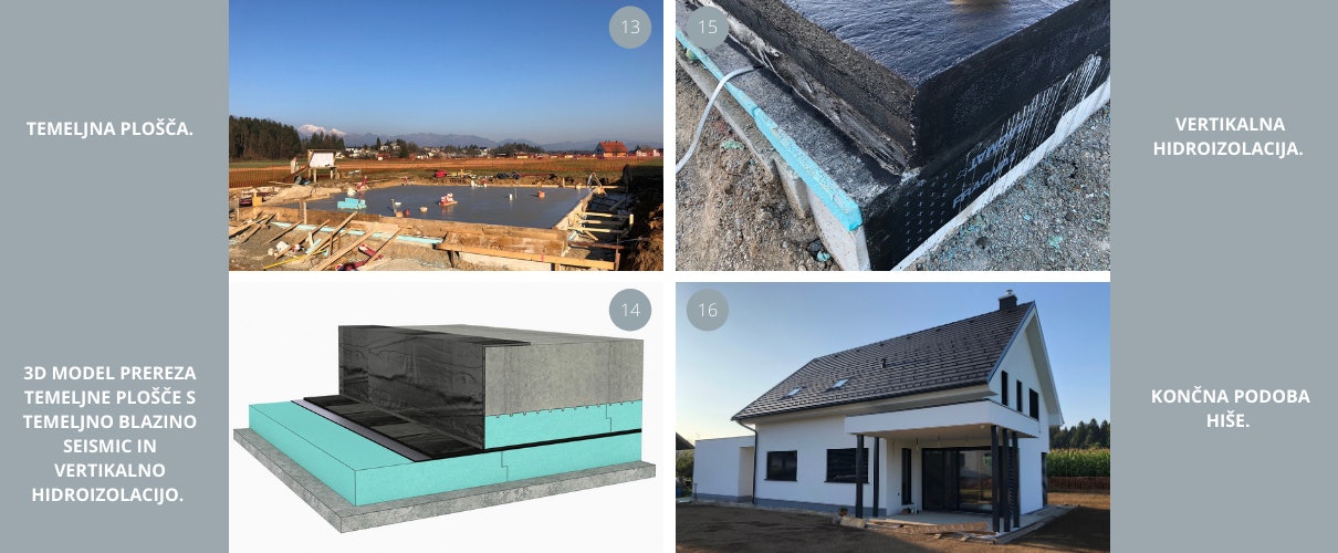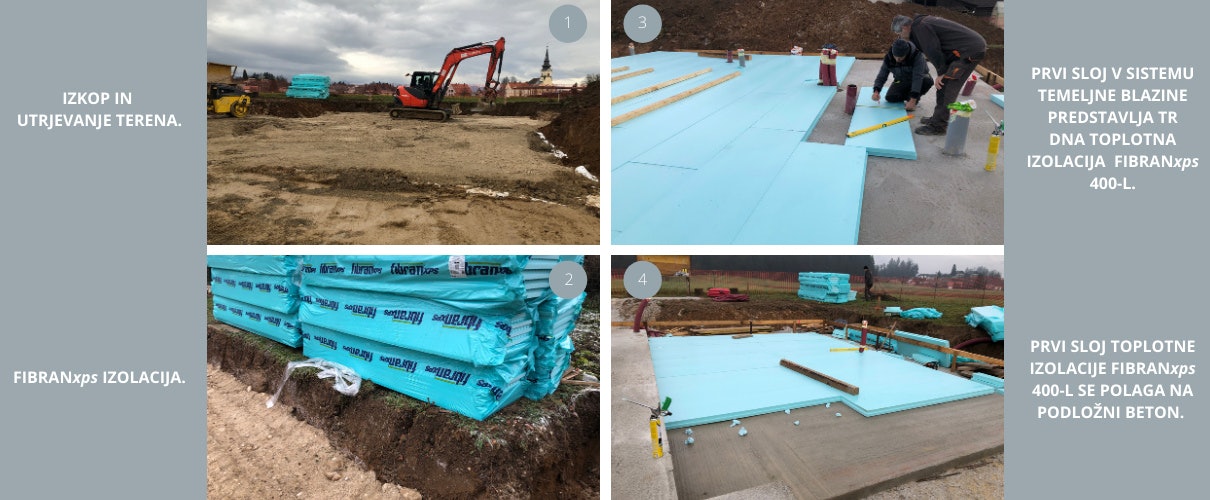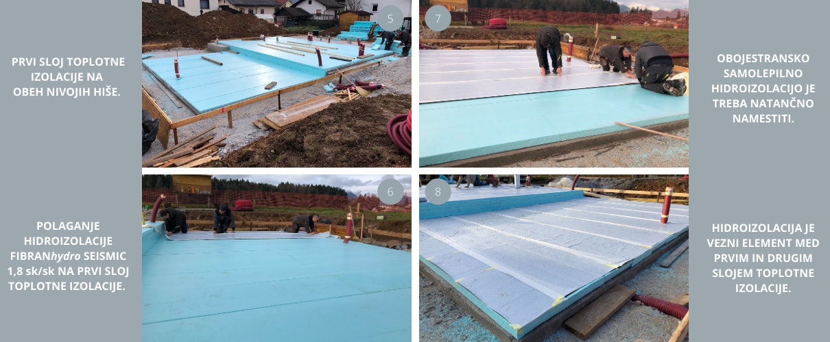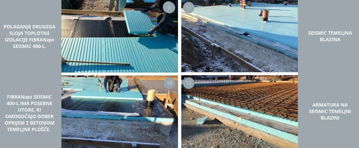 Beim Bau energieeffizienter Gebäude brauchten wir eine Lösung für die Fundamente, die eine durchgehende Wärmedämmung unter dem Gebäude ermöglicht. Das SEISMIC-Fundamentkissen ist eine von FIBRAN entwickelte Systemlösung, die den Herausforderungen der modernen Fundamentierung auf Wärmedämmung gerecht wird. Zudem handelt es sich um ein für erdbebengefährdete Gebiete entwickeltes System, das bei dynamischen Belastungen wie Erdbeben eine nachgewiesene Tragfähigkeit aufweist. Das SEISMIC-Fundamentkissen ist ein Verbund aus Stahlbetonfundamentplatte, Wärmedämmung und Abdichtung, wobei alle Schichten dauerhaft miteinander verbunden sind. Im Falle eines Erdbebens kommt es zu keinem Verrutschen zwischen den einzelnen Schichten. Darüber hinaus wird bei SEISMIC-Fundamentkissen die Abdichtung vor Beschädigungen geschützt, indem sie zwischen zwei Schichten Wärmedämmplatten platziert wird. Und mit zwei Schichten Abdichtung bietet das gesamte System auch Schutz vor hohem Grundwasser. Diese Lösung ermöglicht uns auch eine durchgehende Kontinuität der thermischen Hülle des Gebäudes von den vorgefertigten Hauselementen bis zu den fertigen Elementen unter der Fundamentplatte. Darüber hinaus können wir das Risiko von Frosthebungen unter der Platte verhindern, indem wir den Boden einfach außerhalb des Gebäudeumfangs leicht isolieren. Eine weitere Besonderheit des SEISMIC-Fundamentkissens sind die speziell entwickelten Rillen auf der Oberseite der oberen Wärmedämmschicht, der sogenannten FIBRANxps SEISMIC-Platte. Diese Rillen werden dann mit Frischbeton gefüllt, wodurch eine bessere Verbindung zwischen allen Schichten im System ermöglicht wird. Die Fundamentplatte ist somit mit der zweiten Wärmedämmschicht verbunden, die wiederum über eine doppelseitige selbstklebende Abdichtungsschicht mit der unteren, ersten Wärmedämmschicht verbunden ist.