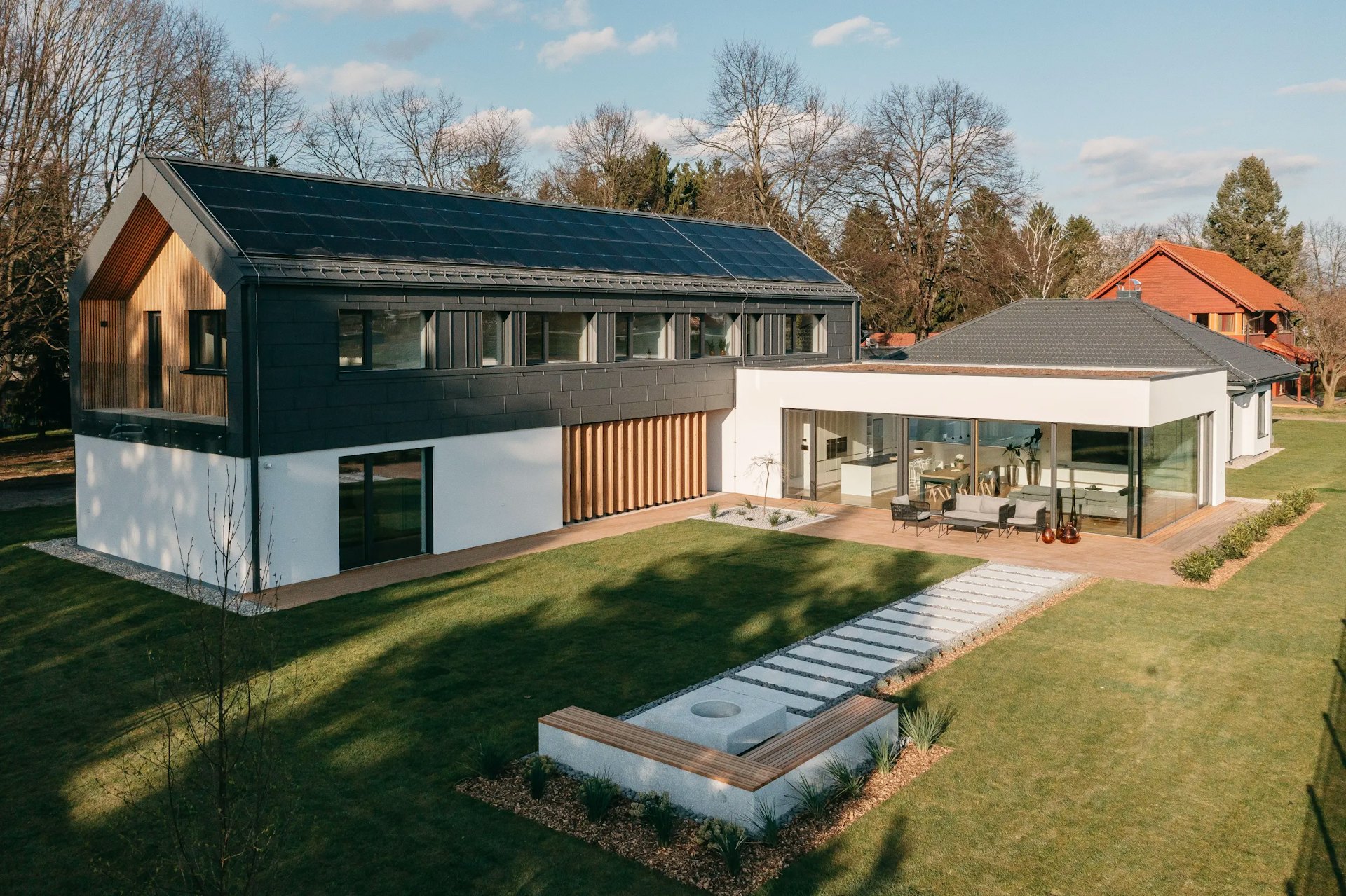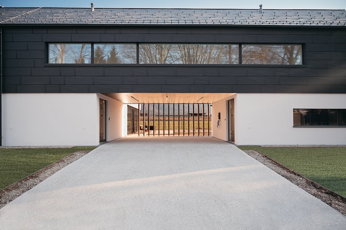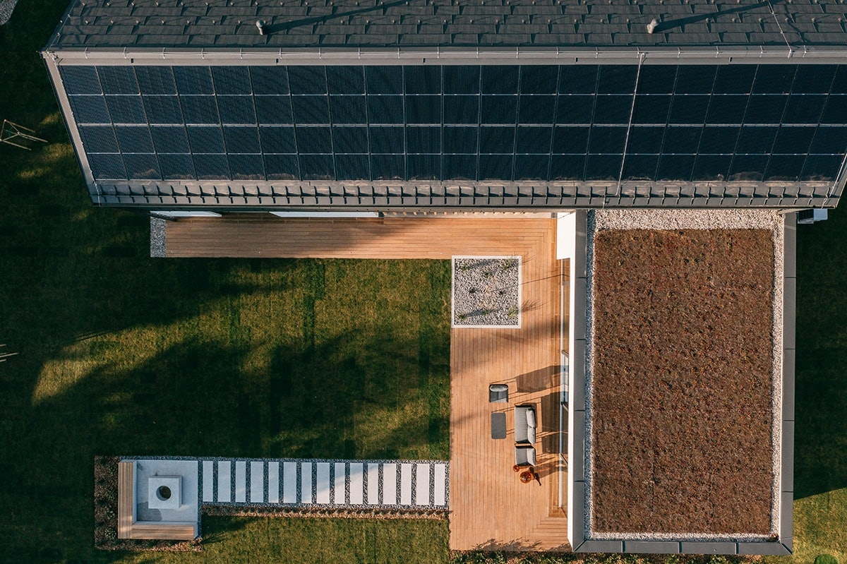 Das Haus ist nach Süden und Westen ausgerichtet, wodurch durch große Glasflächen viel natürliches Licht in die Innenräume gelangt und eine Verbindung zwischen Innen- und Außenbereich geschaffen wird. Das Gründach verbessert nicht nur die ästhetische Wirkung und die Verbindung zur Natur, sondern trägt auch zu einer besseren Isolierung, einer reduzierten Regenwasserableitung und einer geringeren CO2-Bilanz bei. Die Dachneigung ist für die Installation von Solarpanels optimiert, was die energetische Autarkie des Hauses unterstützt.