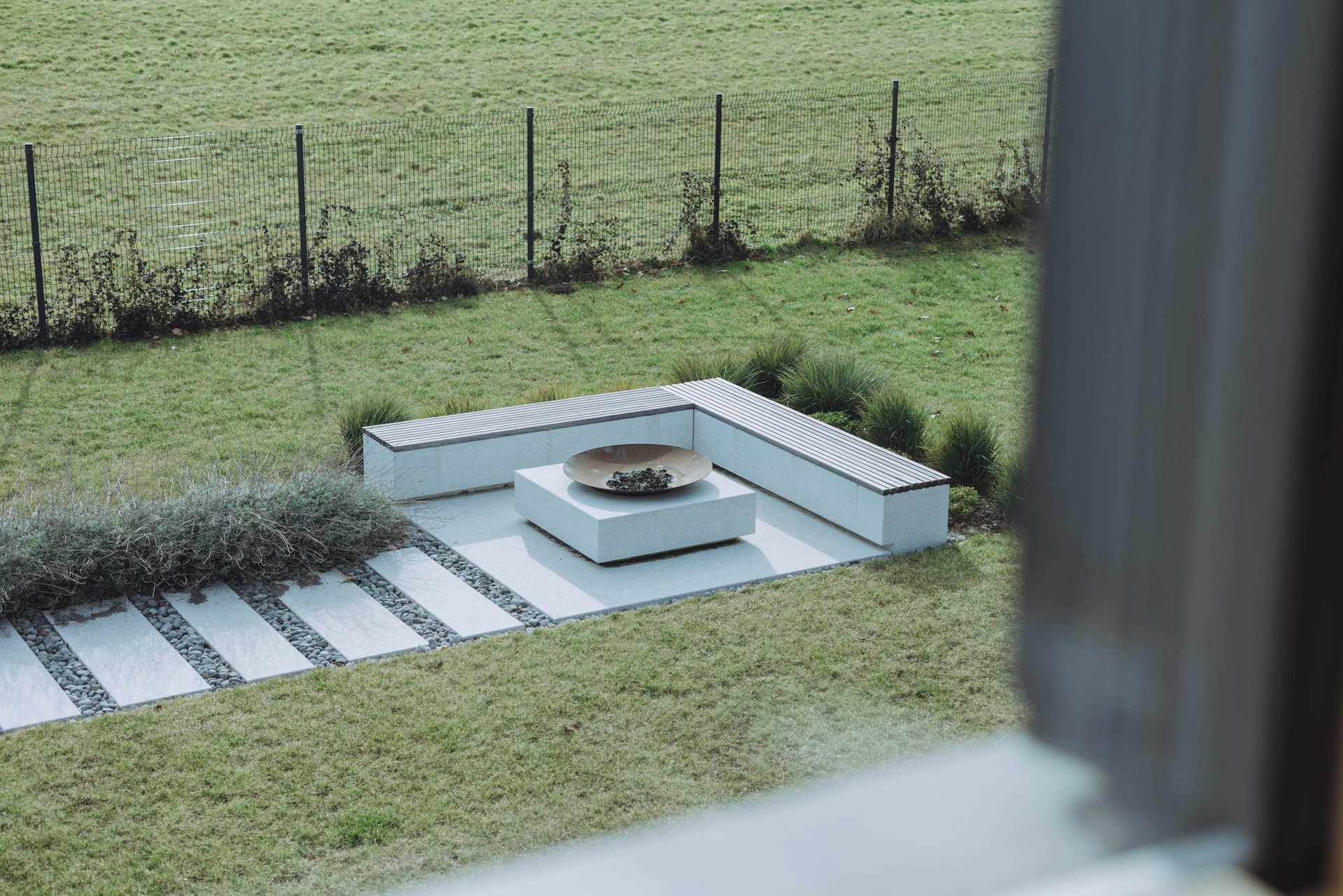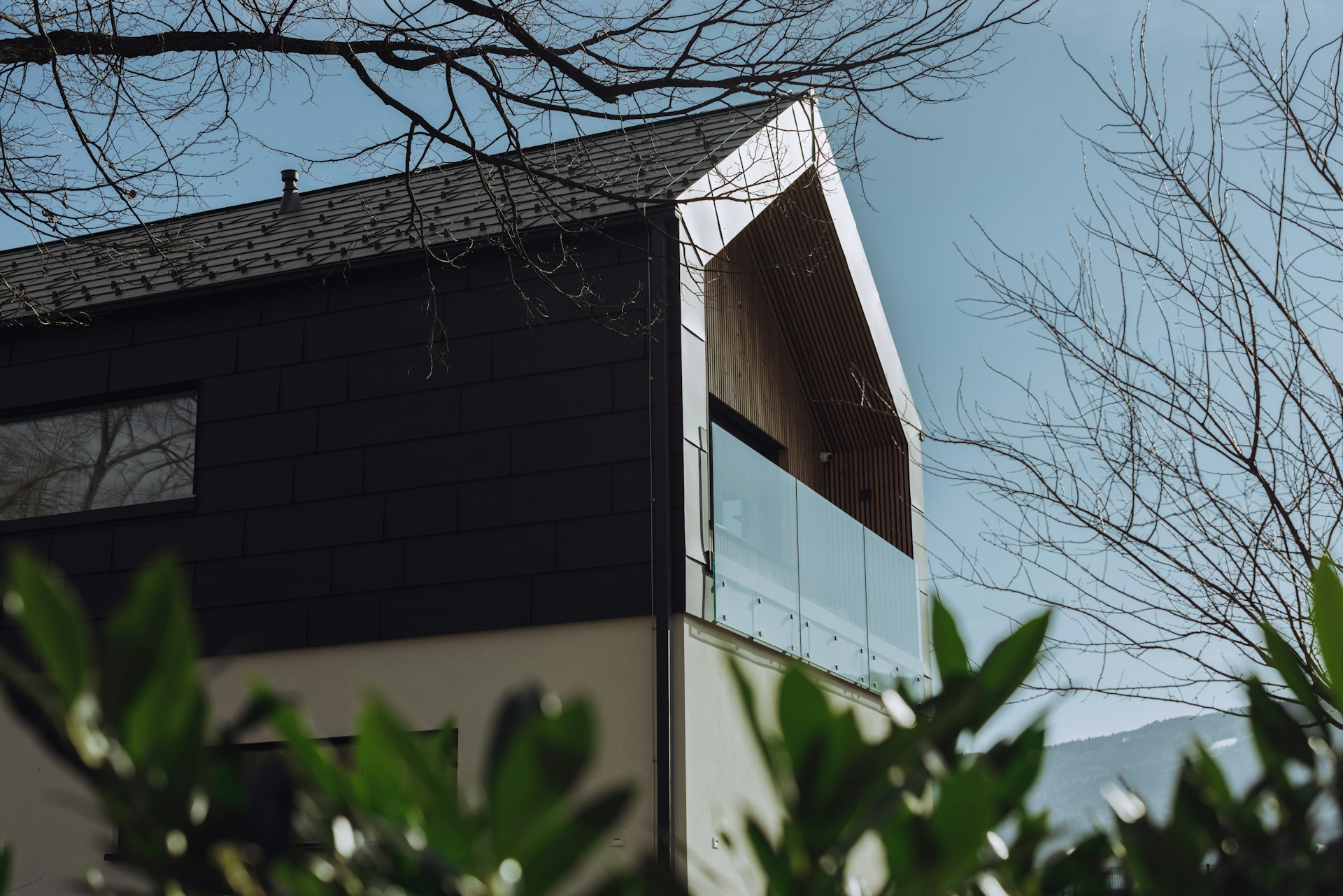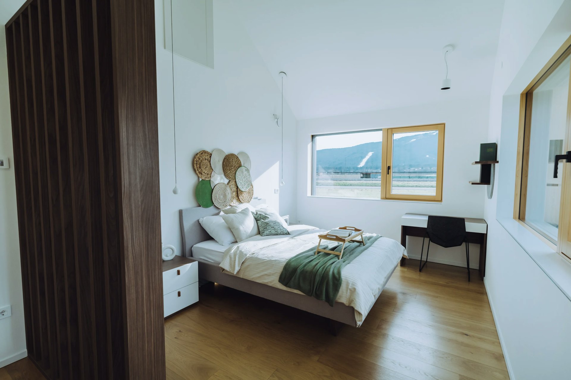Das Haus ist nach Süden und Westen ausgerichtet, wodurch durch große Glasflächen viel natürliches Licht in die Innenräume gelangt und eine Verbindung zwischen Innen- und Außenbereich geschaffen wird. Das Gründach verbessert nicht nur die ästhetische Wirkung und die Verbindung zur Natur, sondern trägt auch zu einer besseren Isolierung, einer reduzierten Regenwasserableitung und einer geringeren CO2-Bilanz bei. Die Dachneigung ist für die Installation von Solarpanels optimiert, was die energetische Autarkie des Hauses unterstützt.