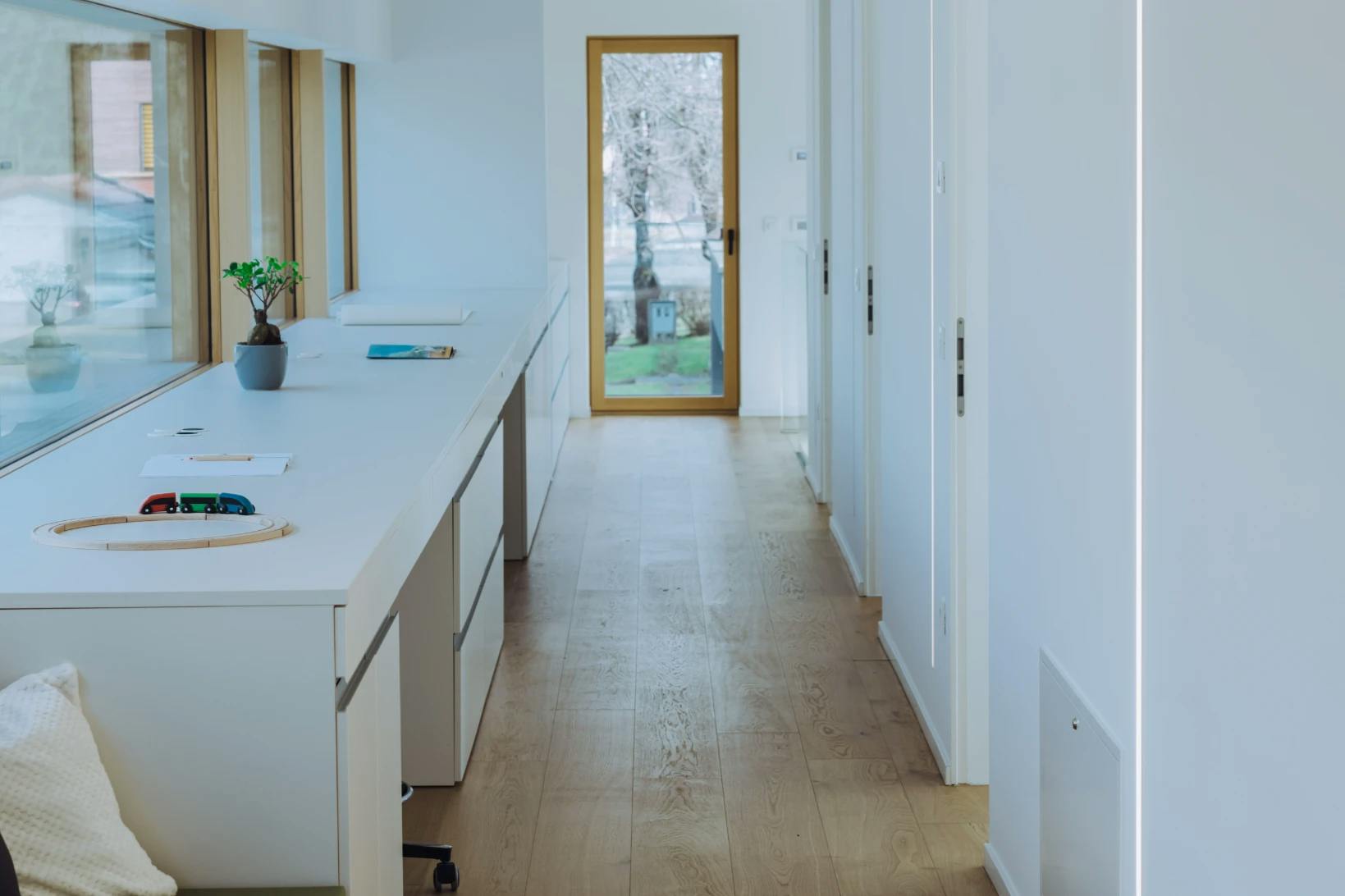 Der zentrale Flur im Haus Dom24h ist als vielseitiger Raum gestaltet, der Familienmitglieder miteinander verbindet und gemeinsames Beisammensein fördert. Ein langes Holzmöbelelement im Flur schafft eine einladende Atmosphäre für gemeinsame Aktivitäten und bietet Raum für Zusammenarbeit. Der Flur verbindet die beiden Kinderzimmer, das Elternschlafzimmer und die Badezimmer, sodass Familienmitglieder sowohl Raum für Gemeinschaft als auch für Privatsphäre haben.