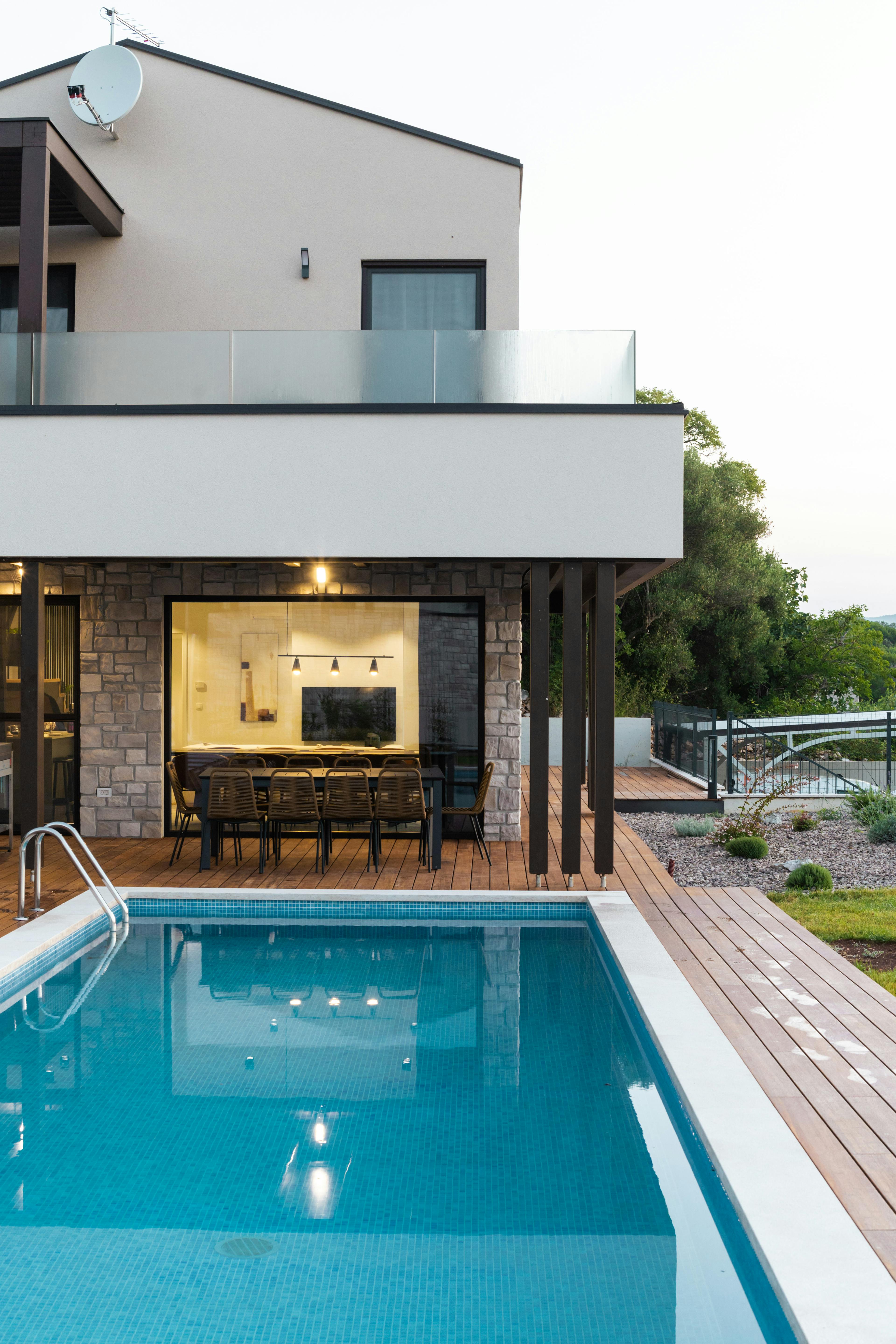 The architecture follows characteristic Istrian elements, reflecting a respect for tradition and local building features. The stone façade and wavy roof tiles blend seamlessly with the surroundings, while the refined appearance of hidden gutters and the gabled roof gives the villas a modern look. The overall impression of the villa is completed by the interior 5-layer oak parquet and the bamboo terrace from our trusted partner Kerowood.