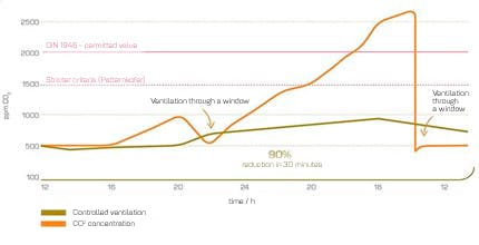 The Marles high-efficiency and passive houses take advantage of controlled ventilation to replace the heating system. This integrated system allows efficient heat recovery, which contributes to the energy self-sufficiency of the house. The diagrams and CO2 graph show how Marles houses provide a sustainable and healthy living environment with the help of an advanced ventilation system.