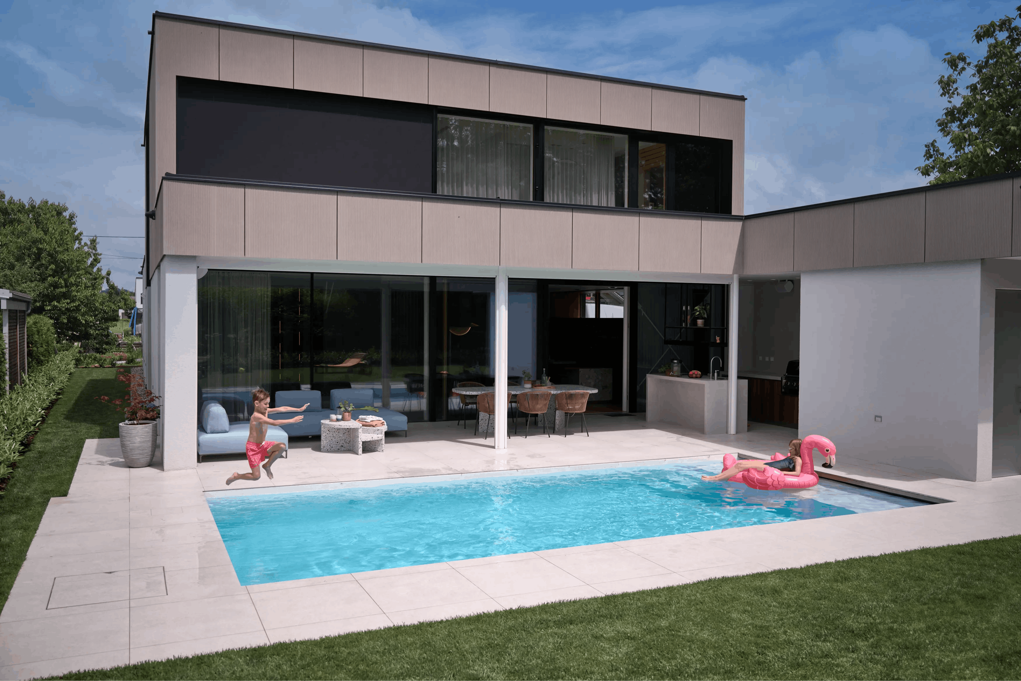 Poseban arhitektonski element je i vanjska natkrivena terasa koja uključuje ljetnu kuhinju, blagovaonicu i lounge prostor, što omogućuje ugodan boravak tijekom svih godišnjih doba. Cijeli vanjski prostor dodatno obogaćuje bazen koji povezuje stambene prostore sa zonom za opuštanje na otvorenom.