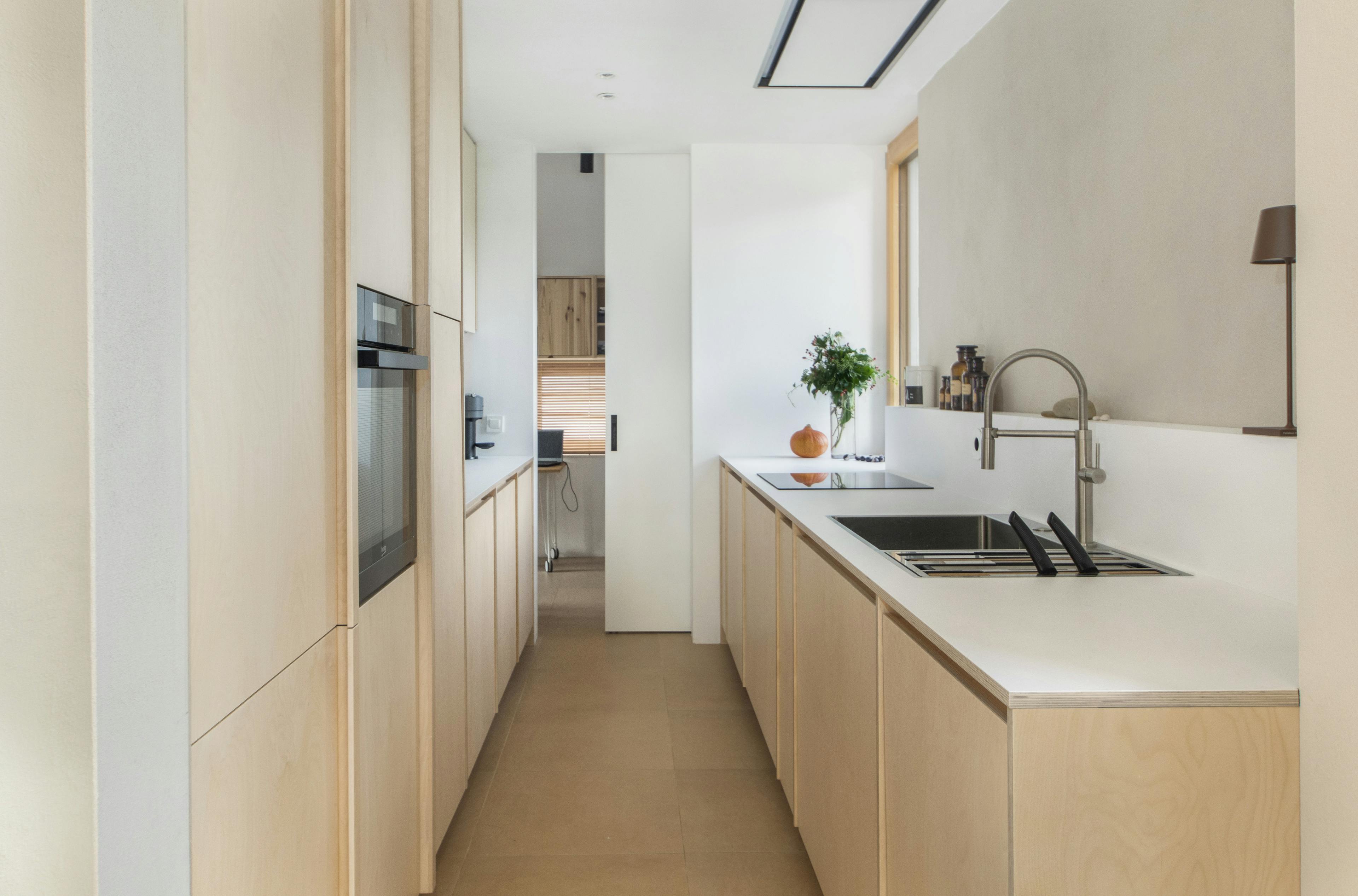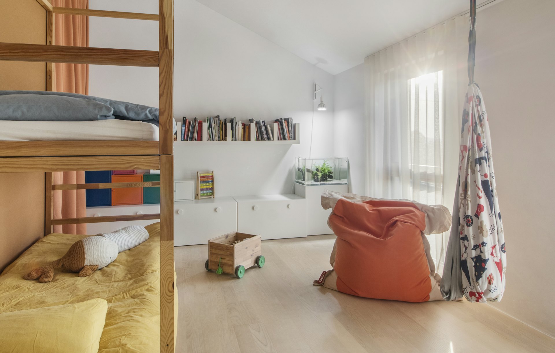 U objektu je fleksibilnošću i velikim volumenom tako dobivena međuetažnost: iz dnevnog se boravka stepenicama penjemo pola kata više, u dio gdje se nalazi velika dječja soba za dva sina, obiteljska kupaonica i spavaća soba. Na ovoj se razini nalazi i zid za penjanje koji je dogovoren s izvođačem već u fazi gradnje. Kombinirajući montažnu konstrukciju s prilagođenim arhitektonskim aspektom ovaj dom postiže maksimalnu iskoristivu površinu bez ugrožavanja udobnosti ili estetike. To je izvrstan primjer kako se naši montažni sustavi prilagođavaju svakom životnom stilu ili potrebama višegeneracijske obitelji.