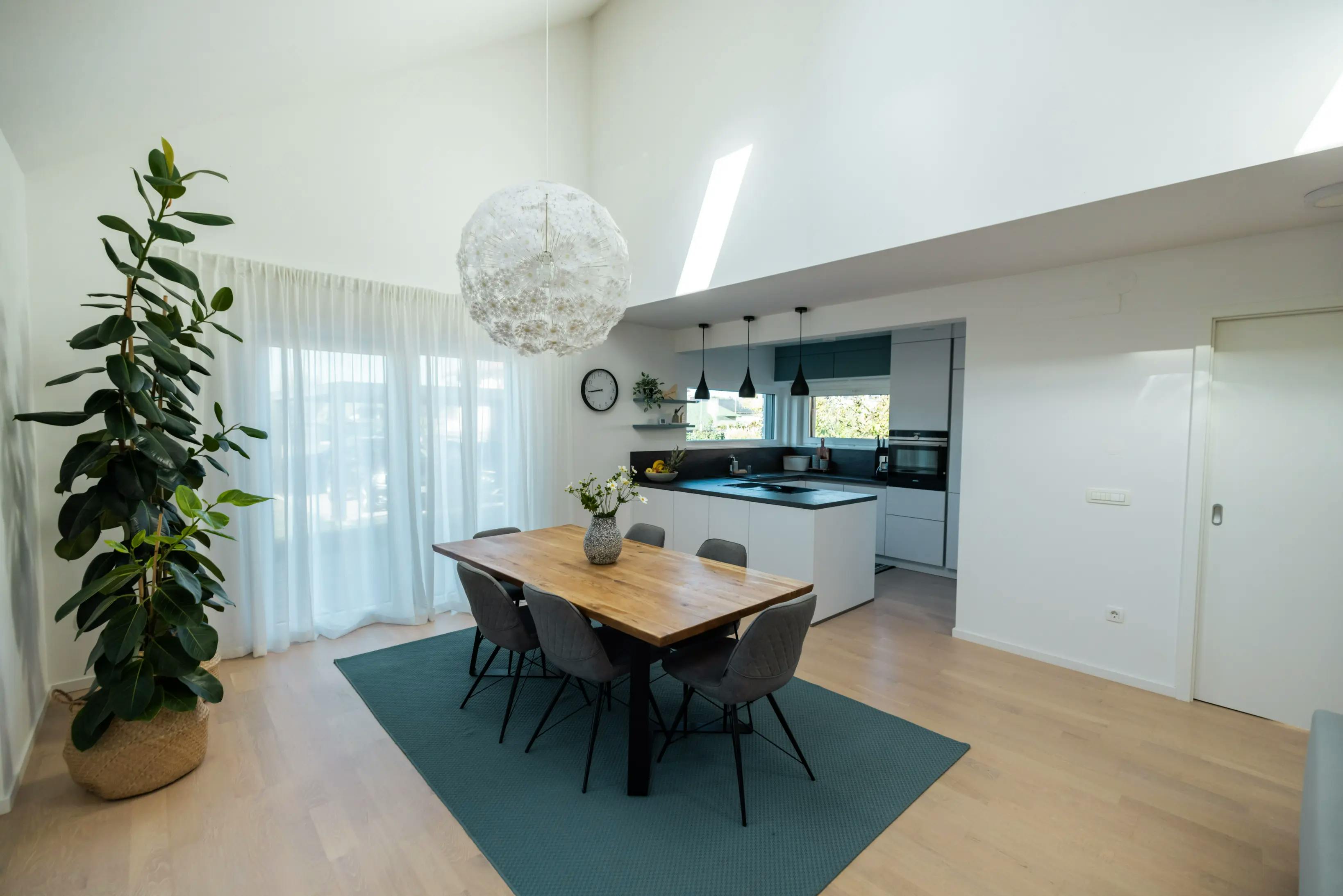 Kuća se ističe izvrsnim arhitektonskim konceptom koji obuhvaća 121,30 m² stambene površine i 25 m² terase, a posebnost kuće je i u dnevnom prostoru s otvorenim krovnim gredama.