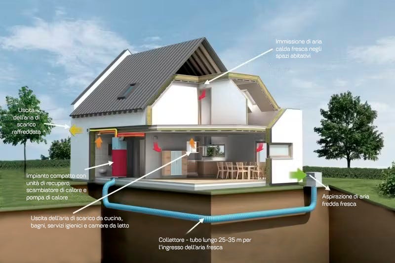 La ventilazione controllata con recupero del calore residuo è essenziale per garantire basse perdite di calore. Le case passive hanno un fabbisogno di calore supplementare estremamente ridotto, poiché sono riscaldate in modo efficiente anche dai guadagni solari. In caso di temperature estremamente basse, è possibile utilizzare il riscaldamento ad aria o la pompa di calore.