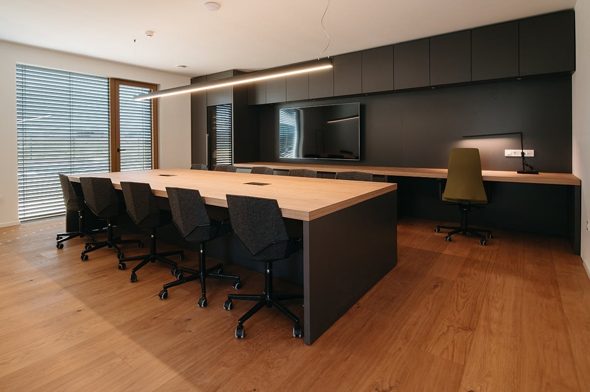 Poslovni prostor: Sodobna arhitektura Dom24h ločuje stanovanjski in poslovni del stavbe. To omogoča popolno ločitev osebnega življenja od delovnega okolja, pri čemer vsak del nudi popolno funkcionalnost. Konferenčna ali sejna soba je primerna za sestanke ali delo blizu doma. Prisotna je majhna kuhinja in WC.