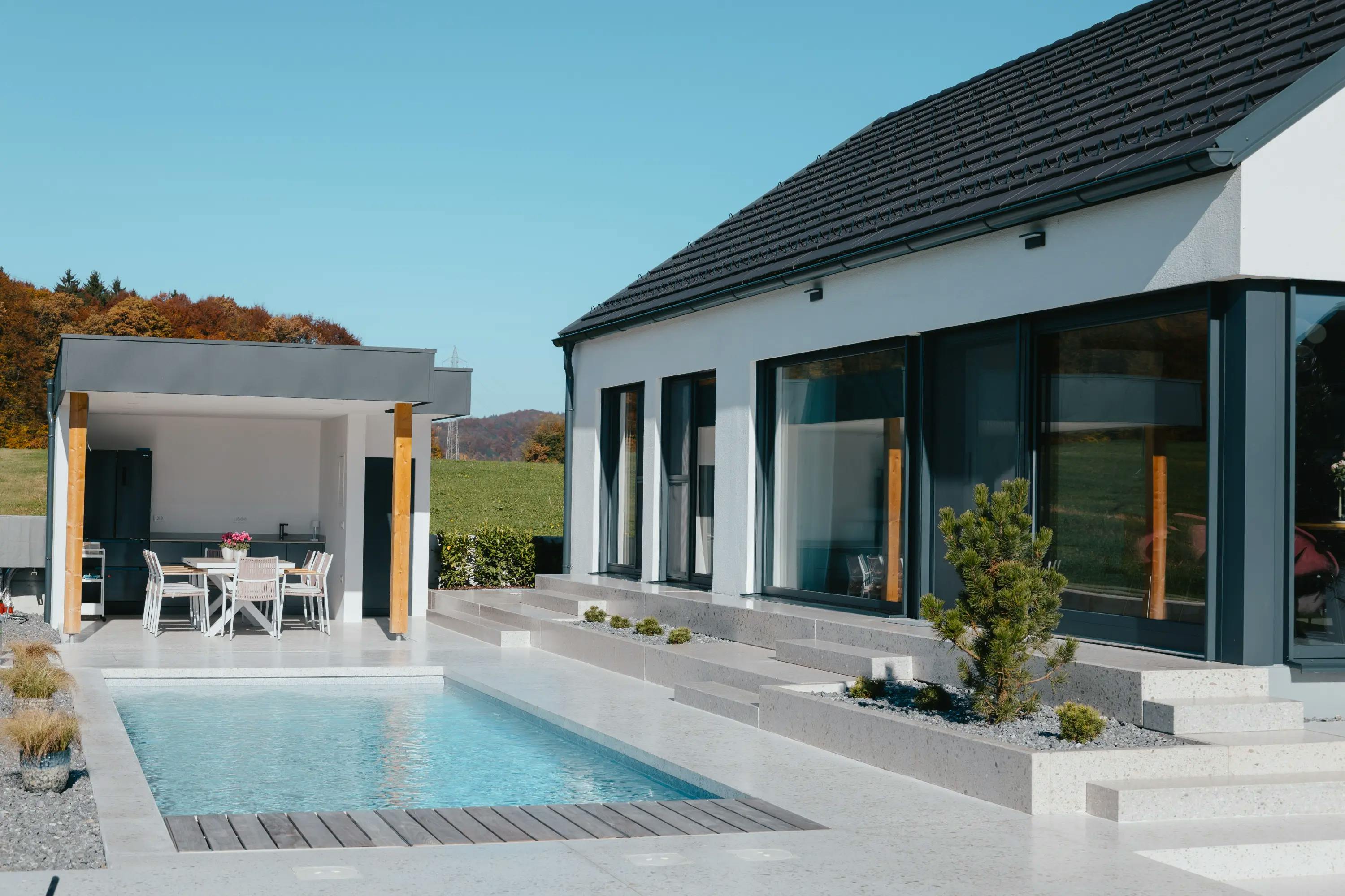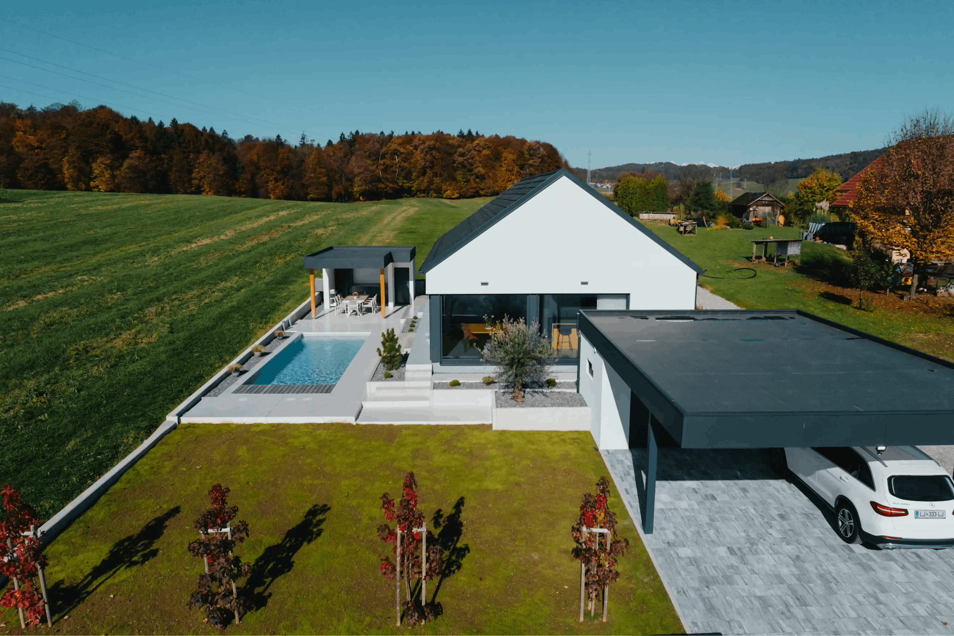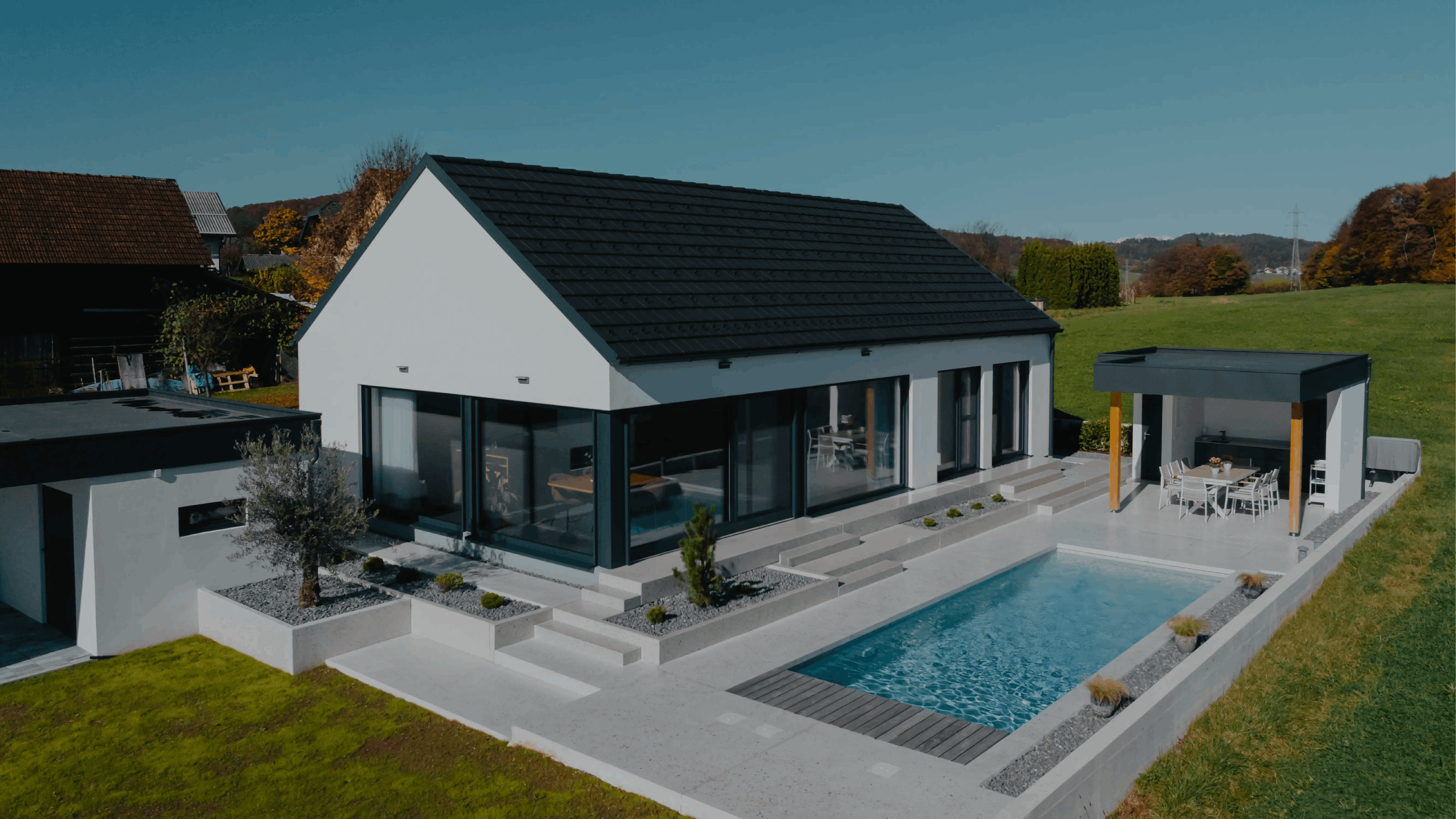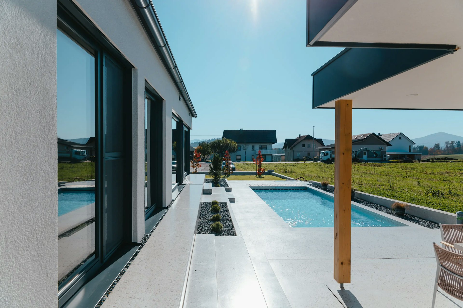 Hiša je bila zasnovana individualno, torej popolnoma po željah stranke in oblikovanosti same parcele. Hiša je umeščena na manjšo parcelo, smiselno pa jo dopolnjuje zunanji bazen s pokrito teraso, ki je odlično izkoriščena v toplejših mesecih.