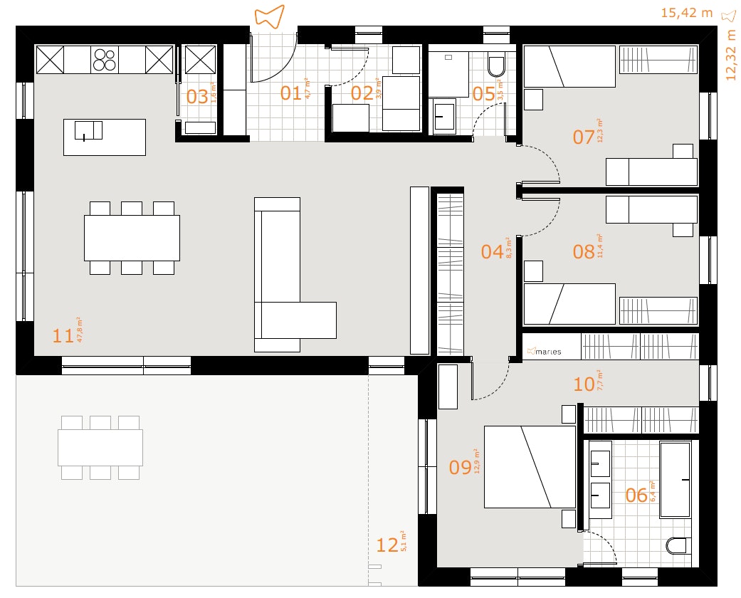 Zaradi svoje pripravljene narave so tipski projekti hiš tudi hitreje izvedljivi. Optimizirani so za učinkovito gradnjo, kar pomeni, da so vsi elementi in materiali že določeni, s čimer se izognete morebitnim zamudam in dodatnim stroškom med gradnjo. To omogoča, da je vaš dom zgrajen hitreje, brez kompromisov glede kakovosti ali funkcionalnosti.
