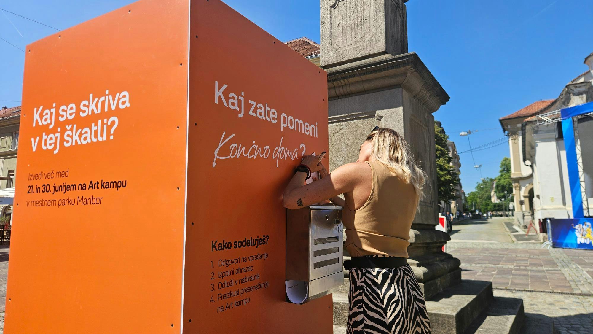 V preteklem tednu je skrivnostna škatla vzbujala zanimanje in spodbujala kreativnost in ustvarjalnost mimoidočih na Grajskem in Glavnem trgu v Mariboru, konec tedna pa se je preselila v Mestni park, kjer je bila tudi razkrita vsebina škatle. »Škatlo smo najprej postavili in predstavili tam, kjer smo doma. Mariborčani nas niso razočarali – prejeli smo veliko sporočil v našem nabiralniku in z njimi bomo nadaljevali zgodbo "Končno doma". V škatli se je skrivala XL Marles Jenga, ki sedaj krasi Art Kamp,« pojasnjuje Nika Bratović, vodja marketinga in komunikacij pri Marlesu. Marles Jenga je narejena iz lesenih ostankov hiš, ki jih Marles sicer reciklira.