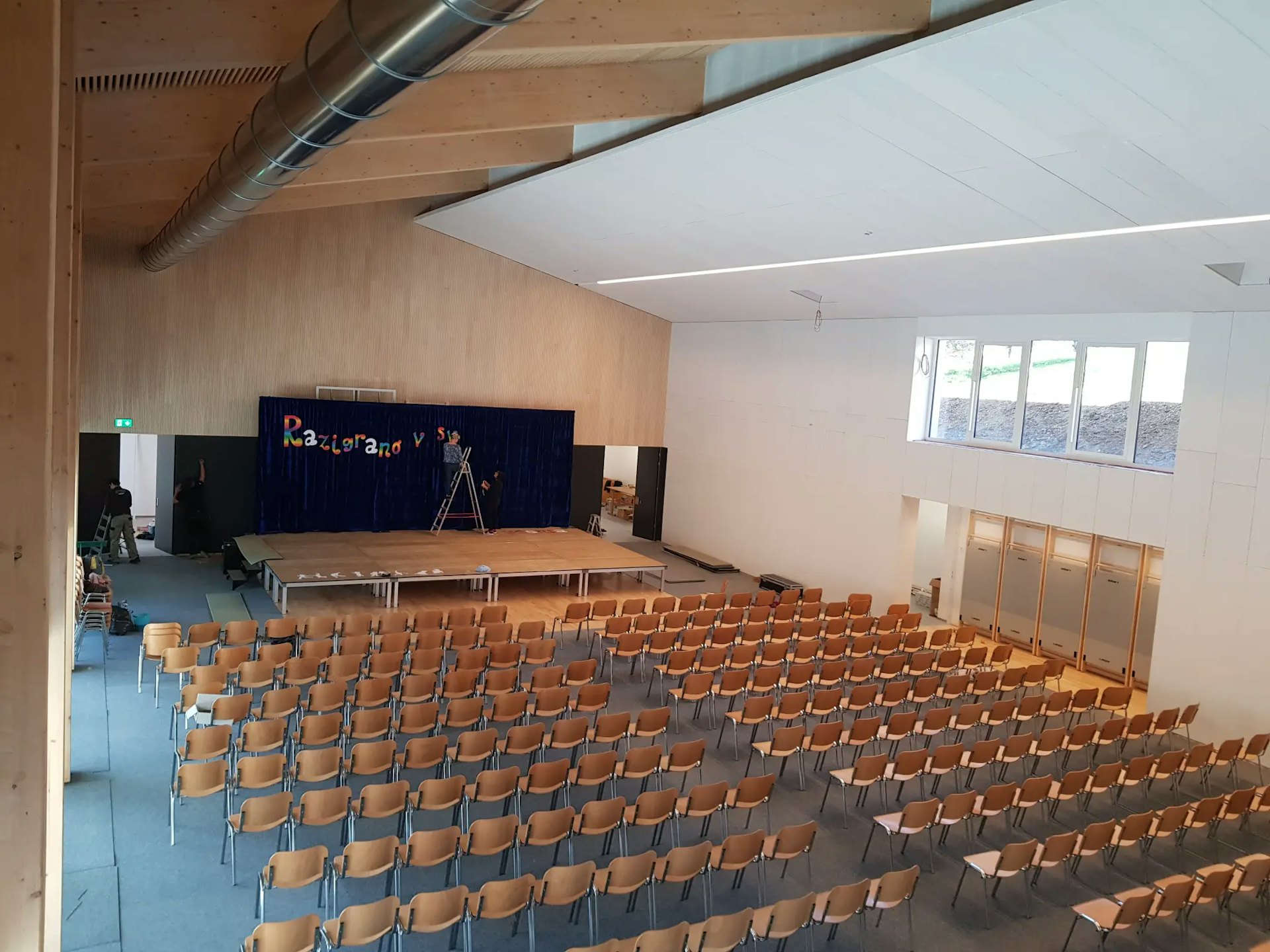Dozidava šole za 227 m² in lesena telovadnica skupaj oblikujeta manjši trg, ki varuje vhod v šolo, pri čemer je z domiselnim oblikovanjem preprečeno, da bi objekt vizualno izstopal med vaškimi hišami ali zasenčil bližnjo cerkev.